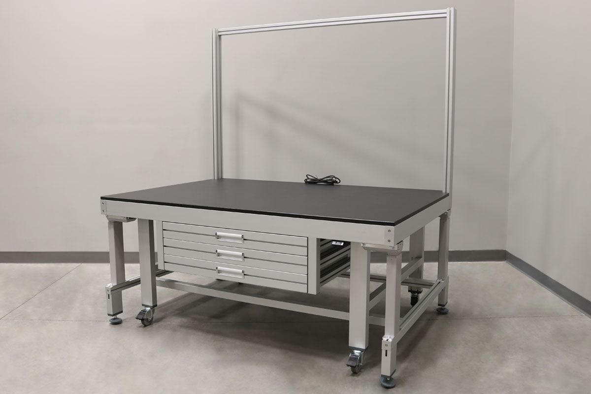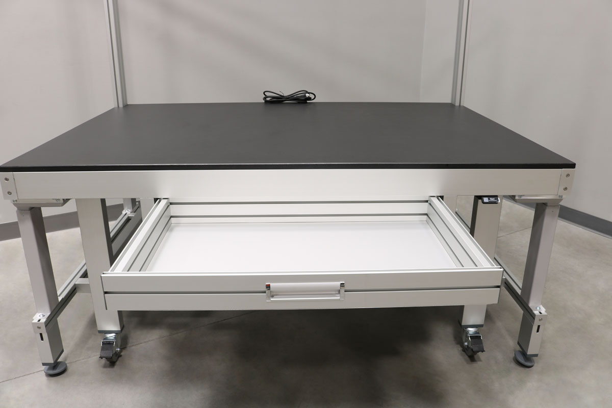 For workstations that are moved around a lot turning your table into a cart with the push of a button is handy. Battery power packs are available to enhance portability. Table legs lift workstation off the casters to provide a stable station.