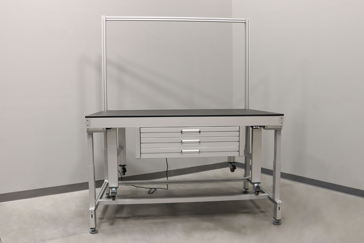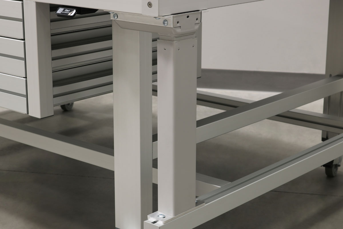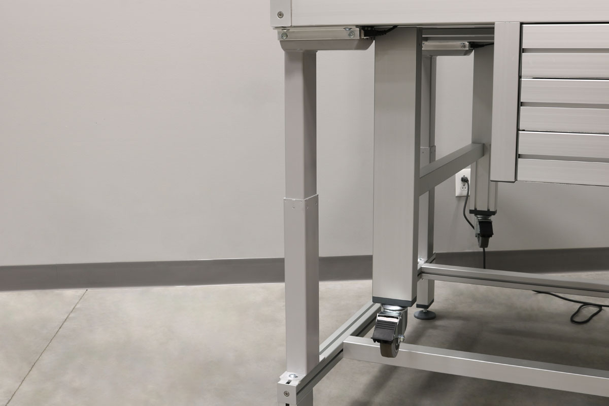 For workstations that are moved around a lot turning your table into a cart with the push of a button is handy. Battery power packs are available to enhance portability. Table legs lift workstation off the casters to provide a stable station.